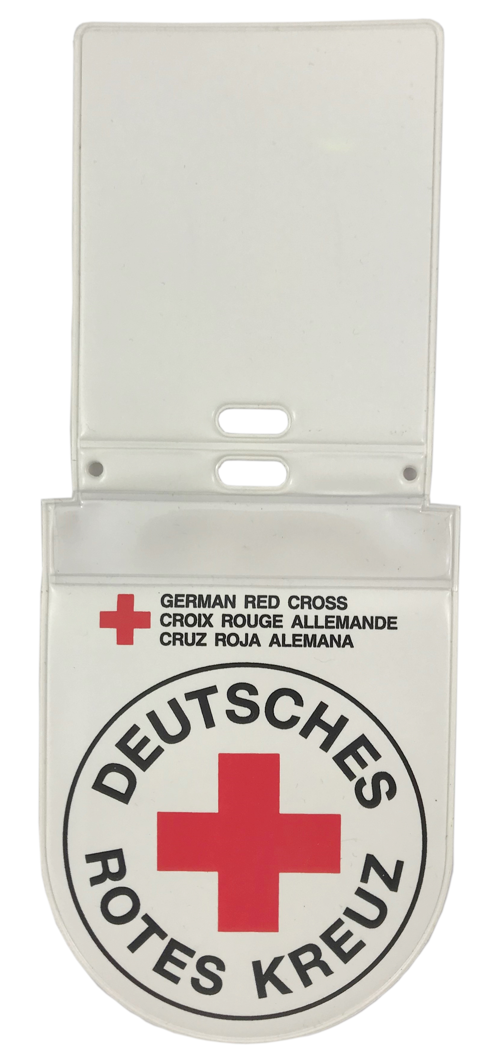 Brustanhänger Motiv DRK Deutschland. Weiß ca 132 x 94 mm. Mit Klarsichtfach ca 15 x 85 mm für Namensschild